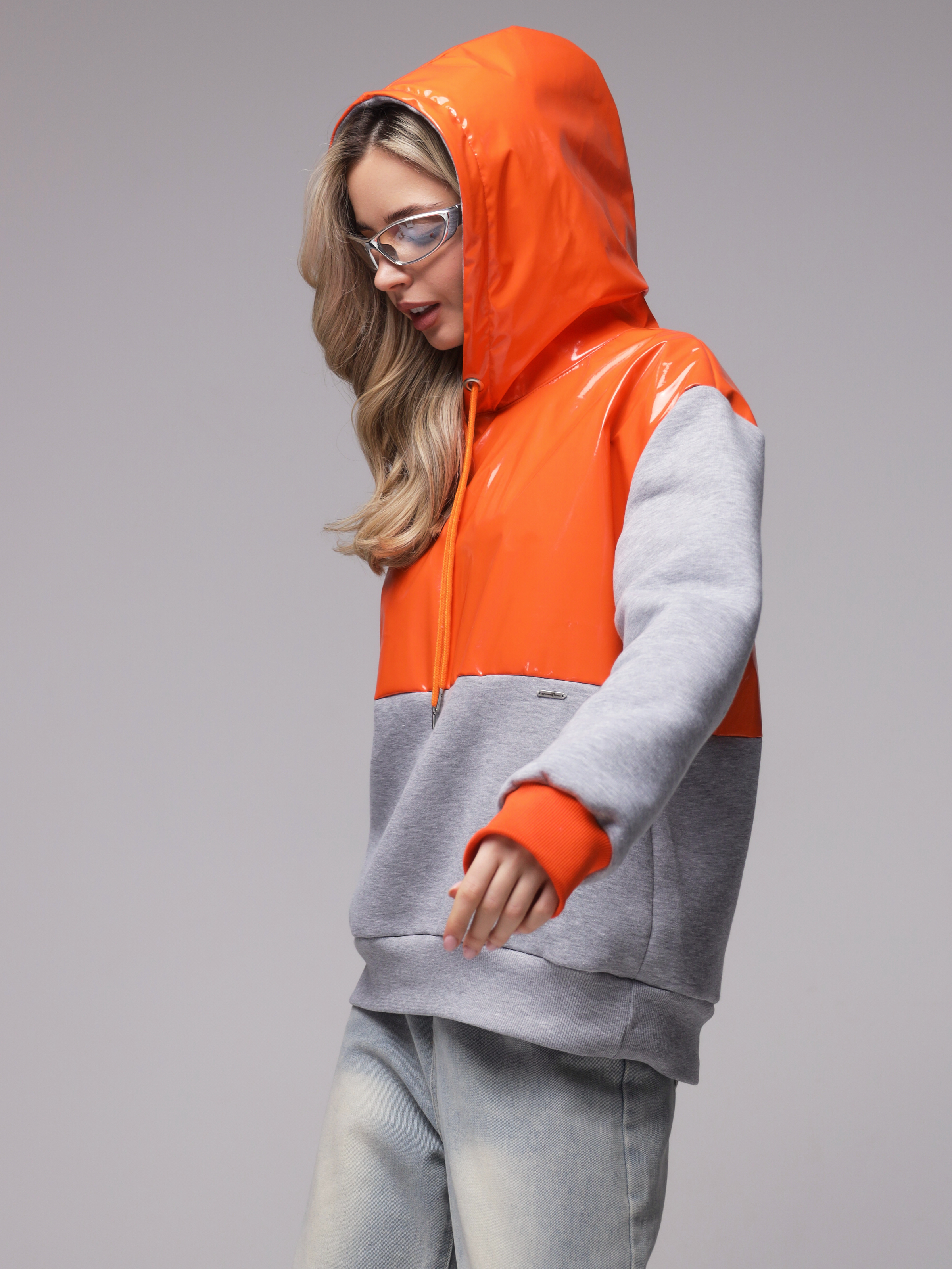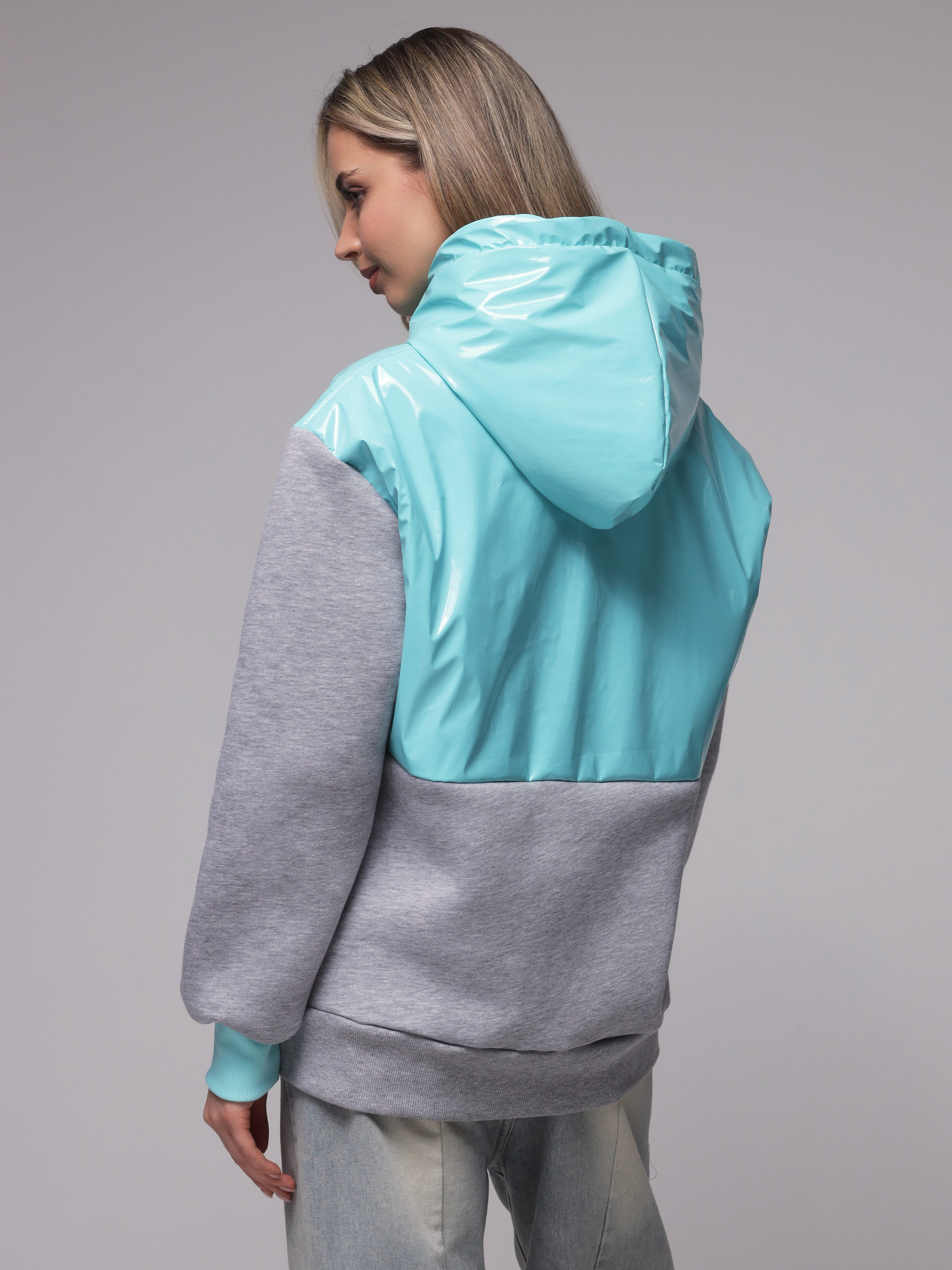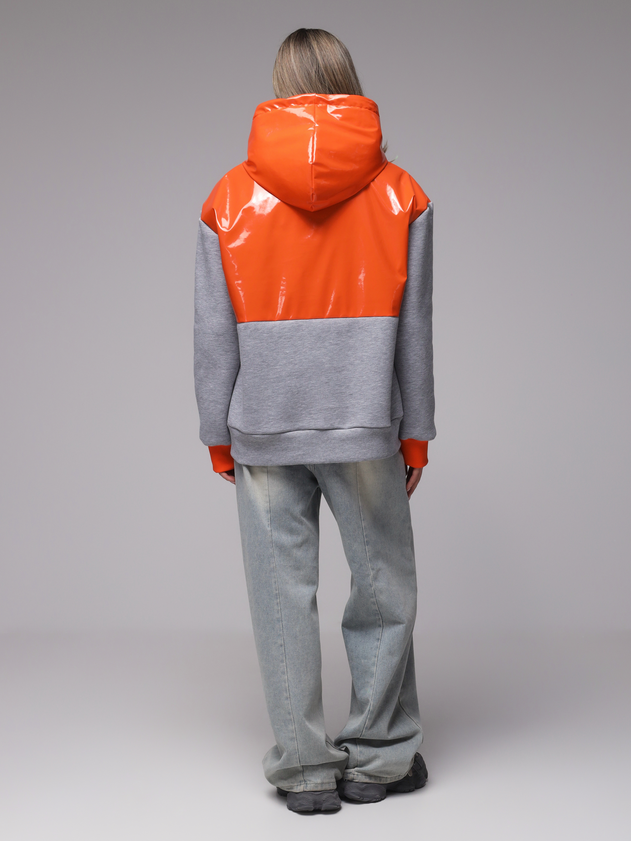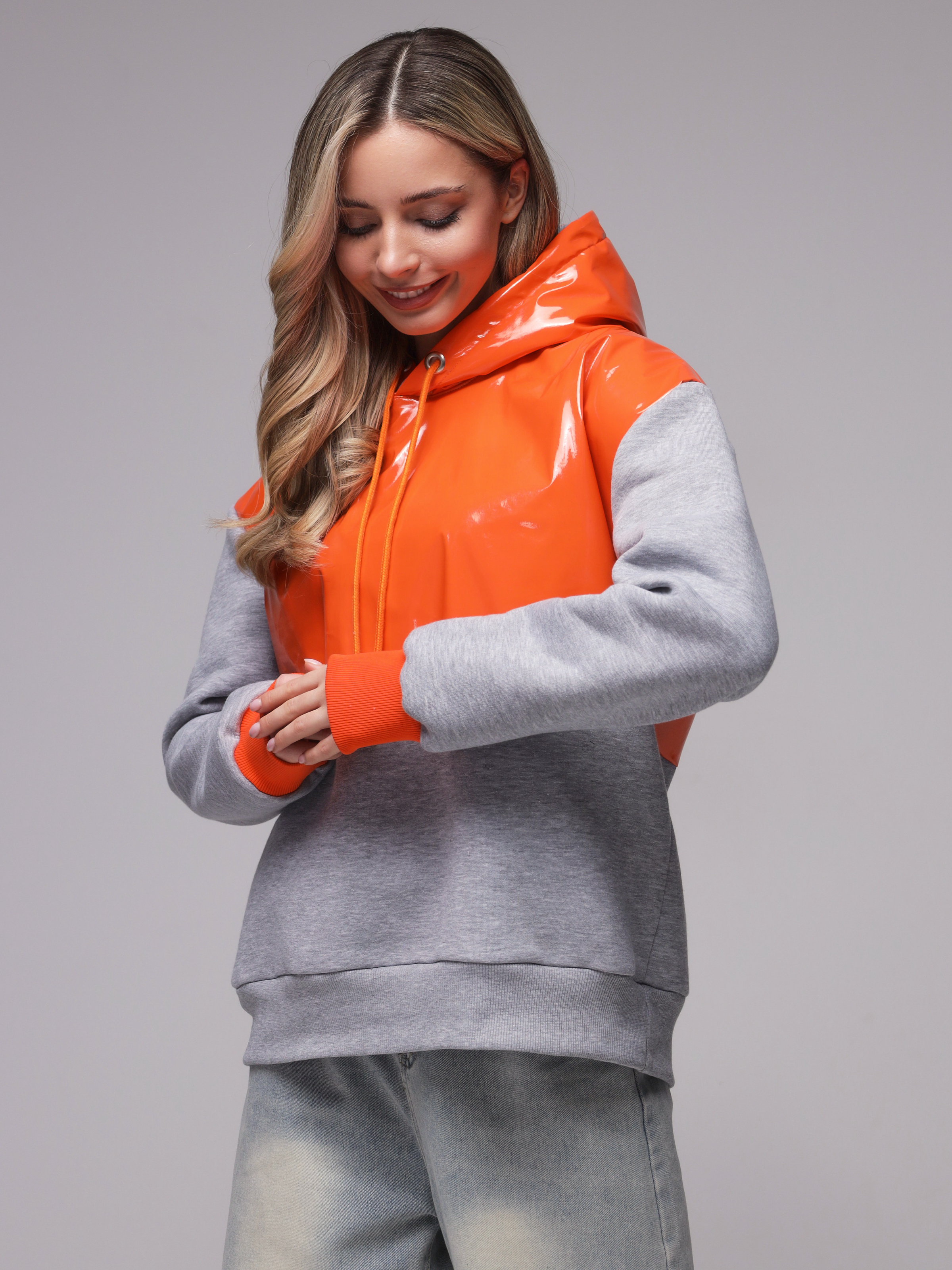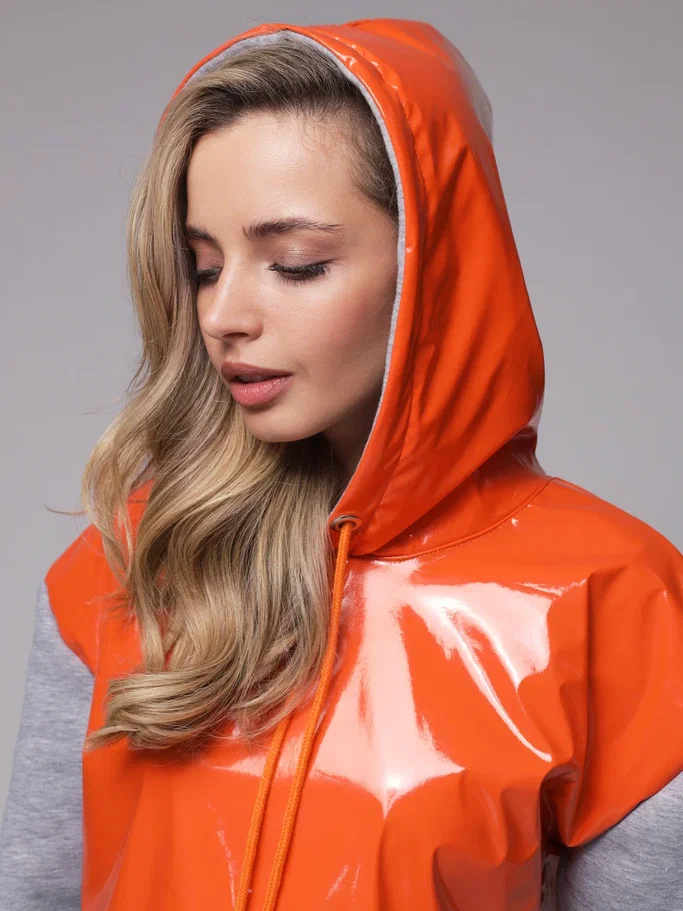 Яркое необычное худи с глянцевым верхом. Доступные цвета верха - необычный мятный, оранжевый и нежный розовый. Верх худи - ткань "лаке" производства Италии, само худи выполнено из турецкого футера высшего качества (компакт пенье) с начесом.