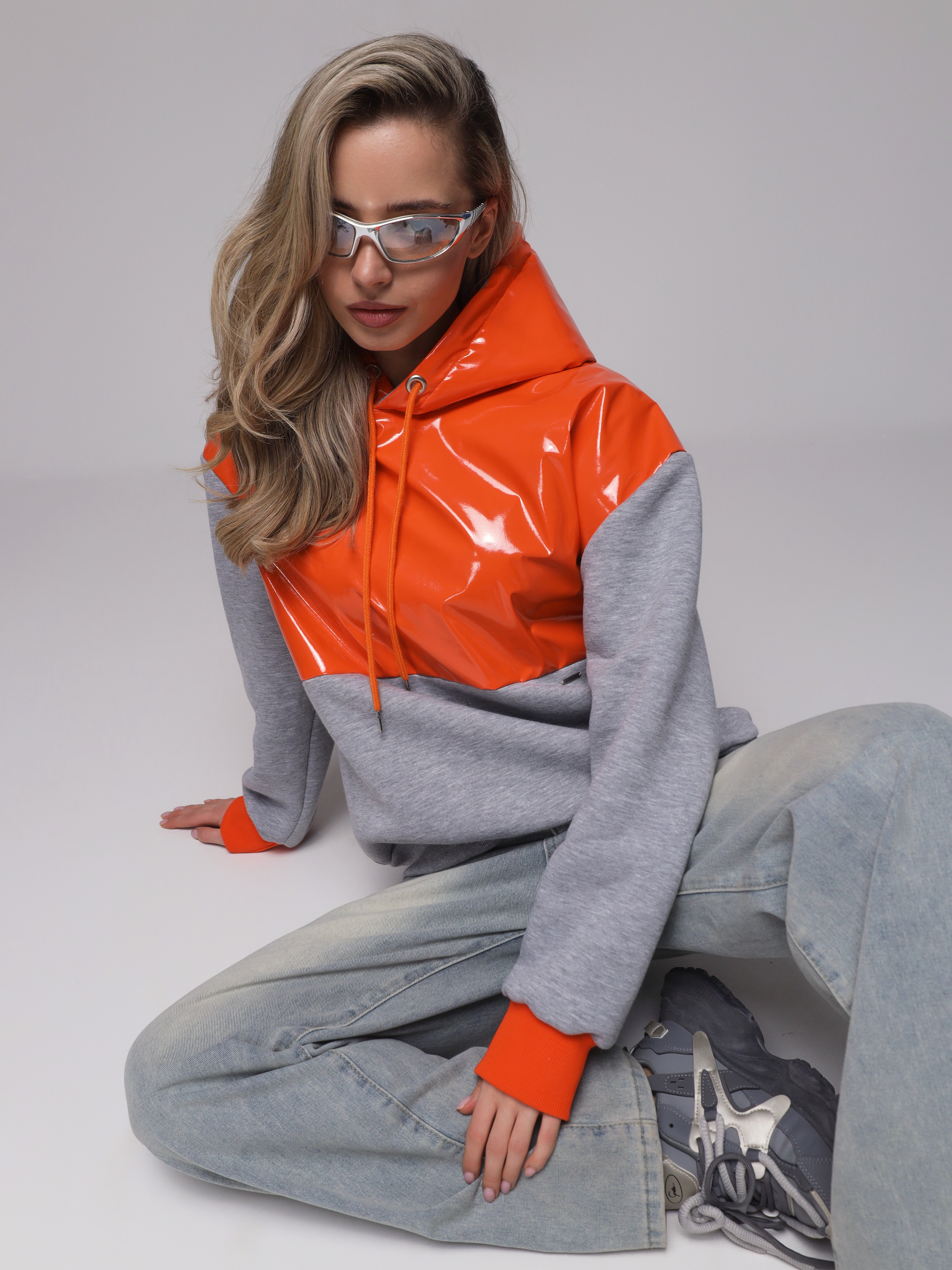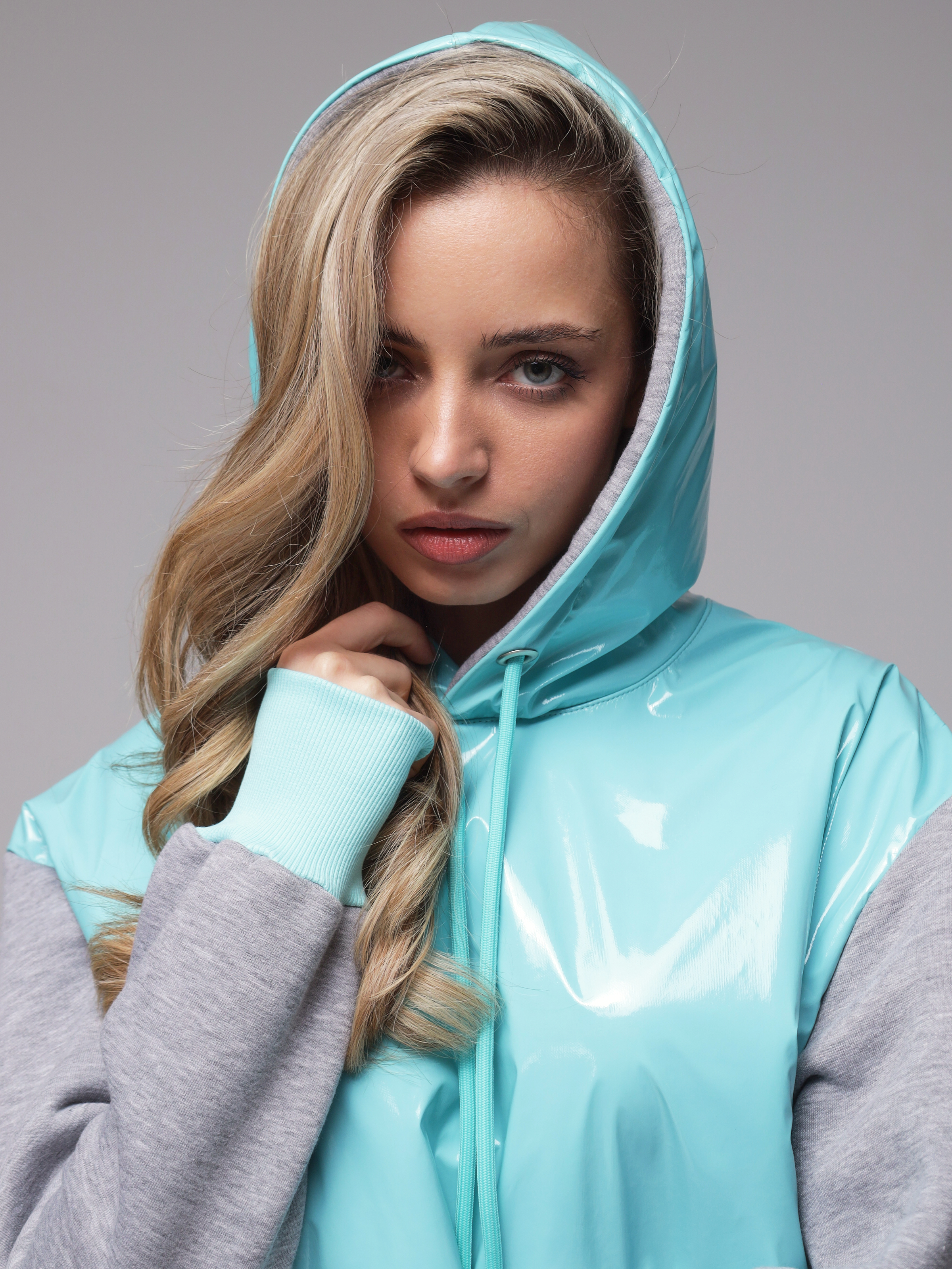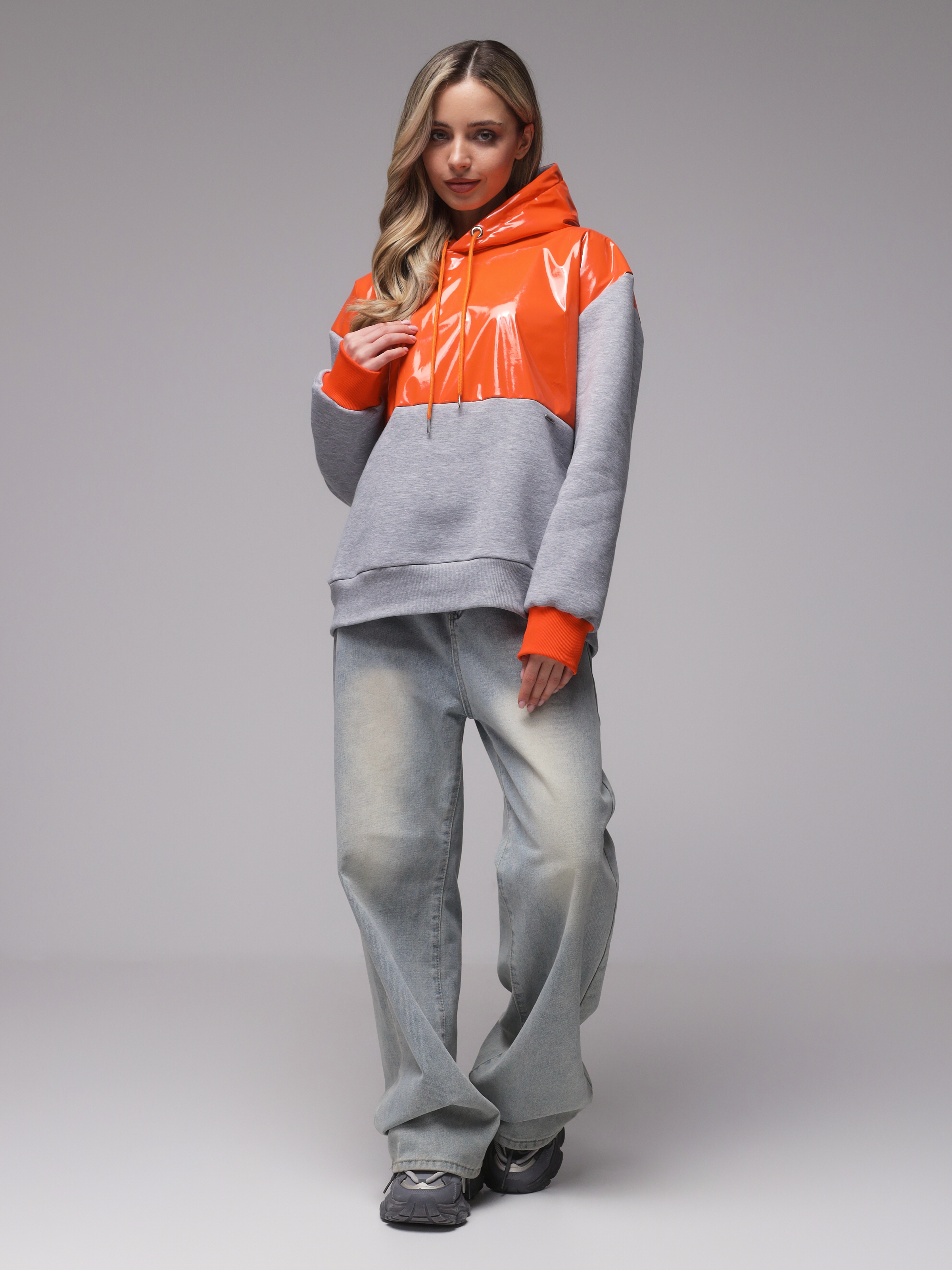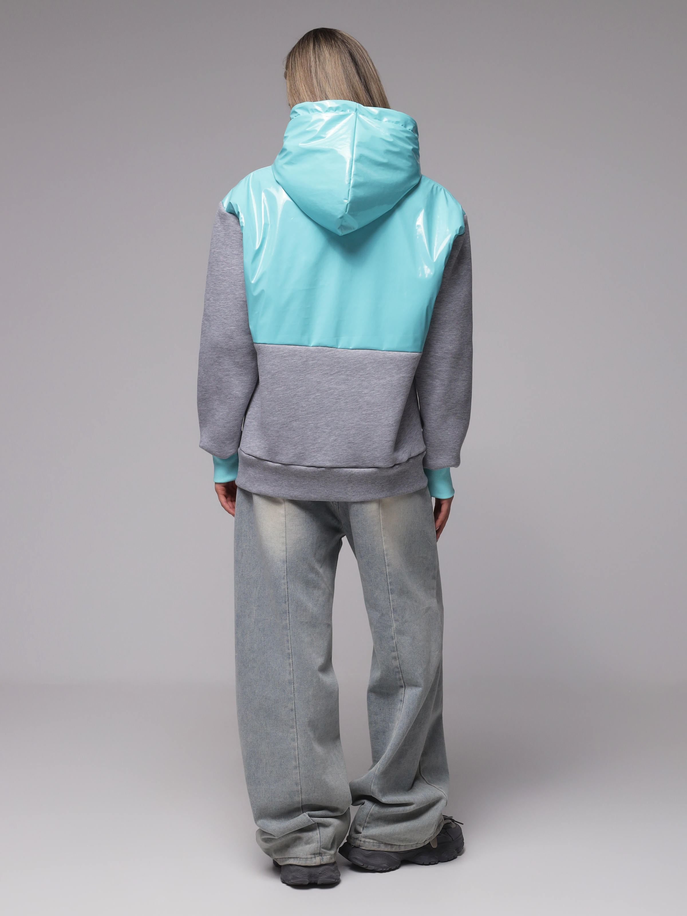 Яркое необычное худи с глянцевым верхом. Доступные цвета верха - необычный мятный, оранжевый и нежный розовый. Верх худи - ткань "лаке" производства Италии, само худи выполнено из турецкого футера высшего качества (компакт пенье) с начесом.
