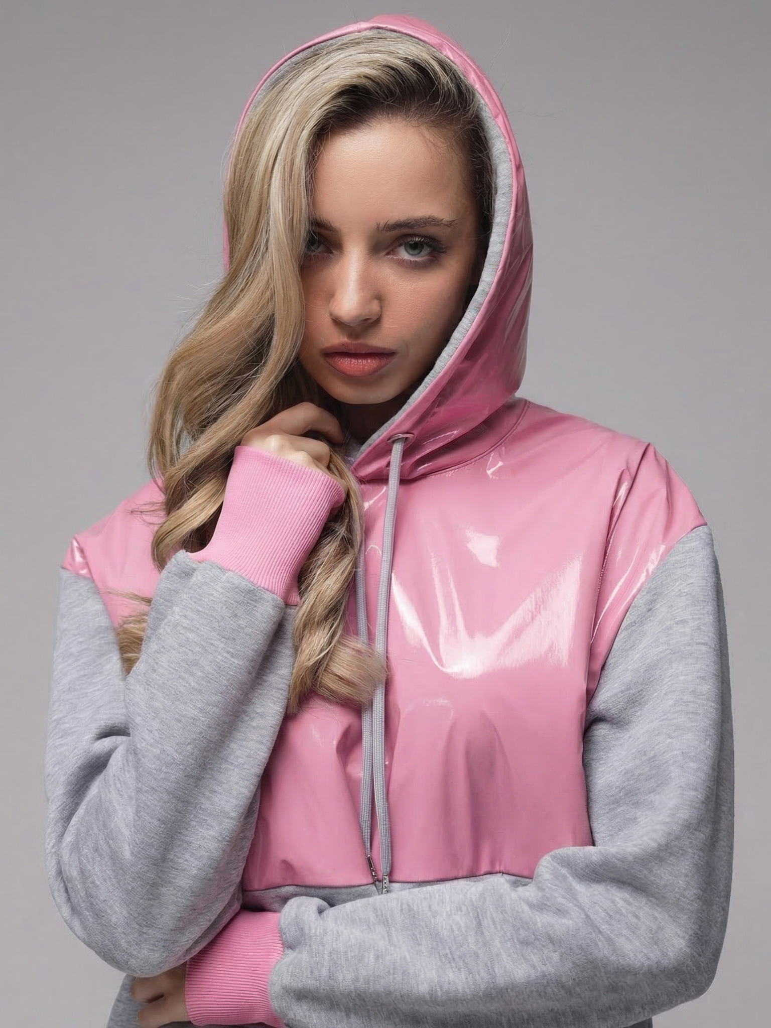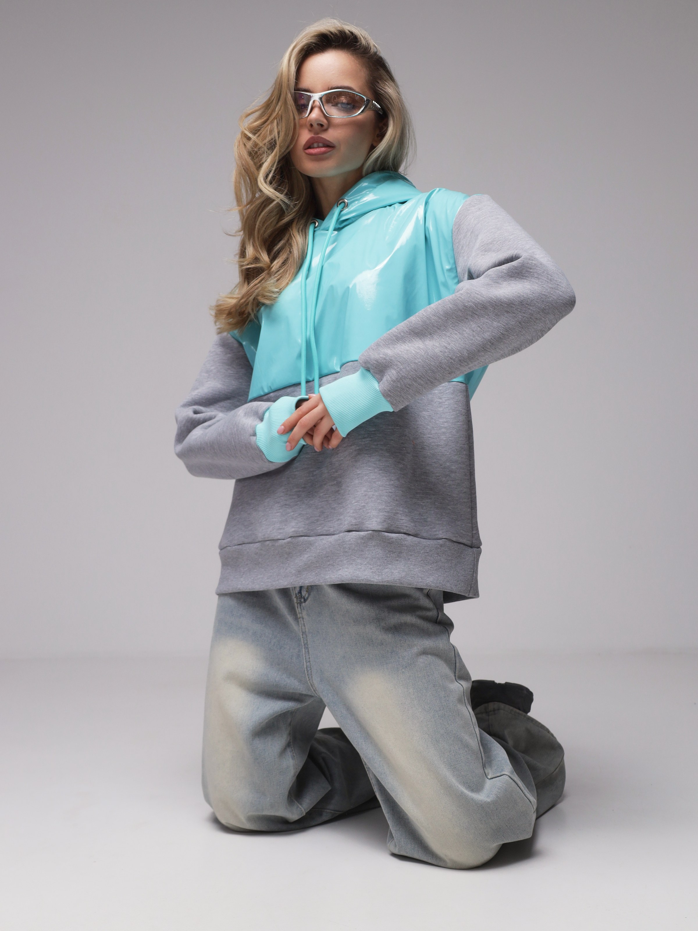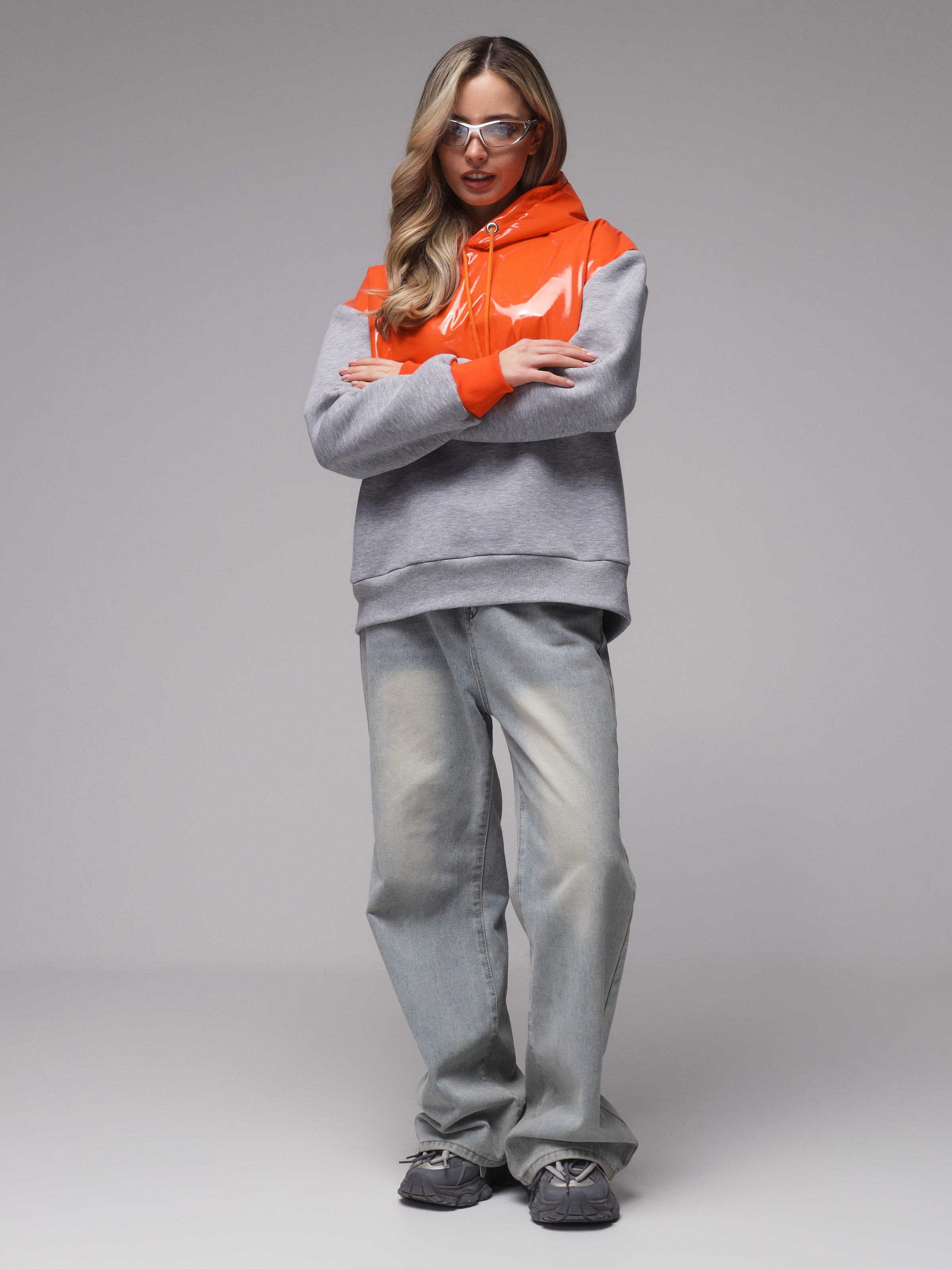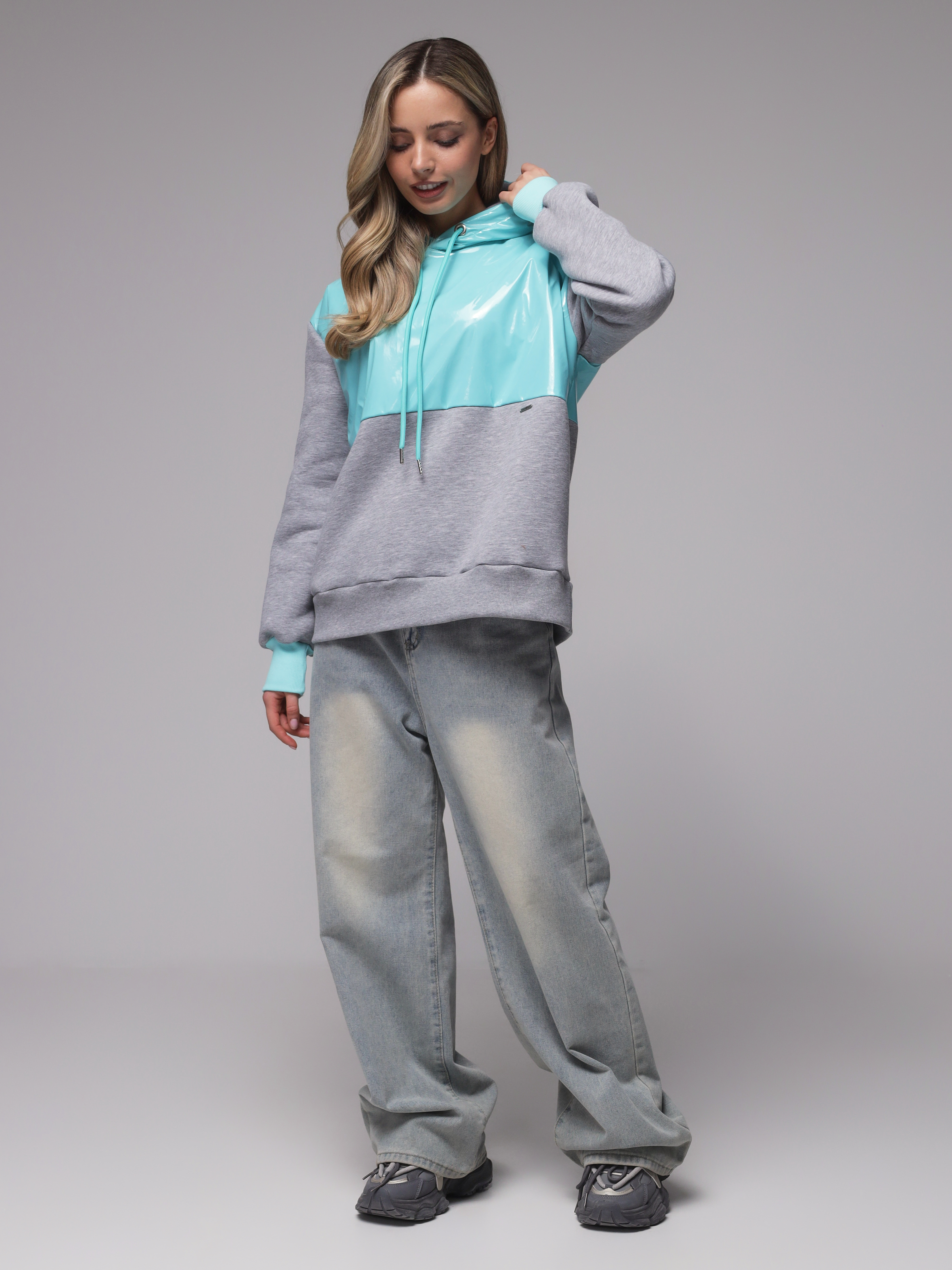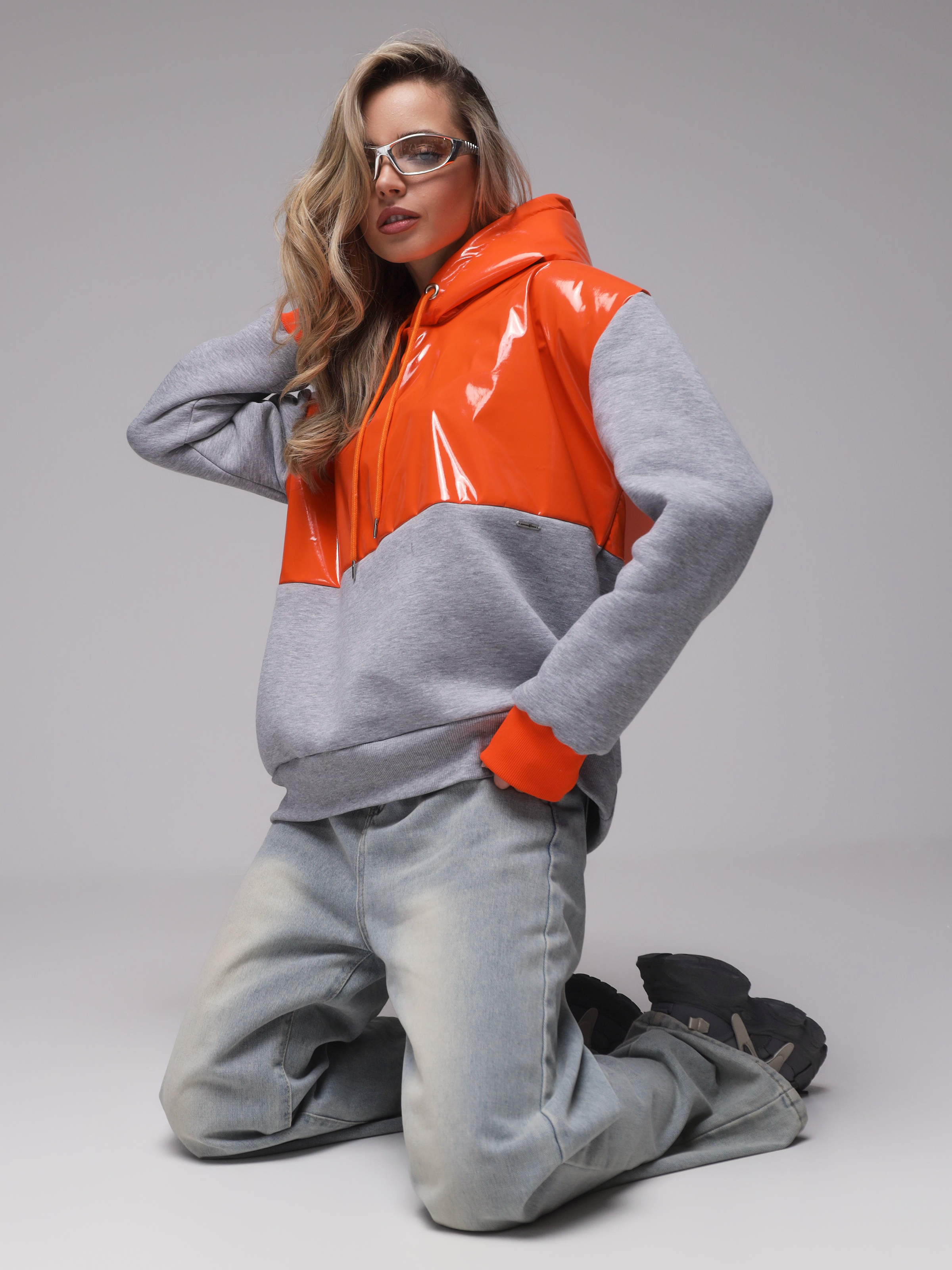 Яркое необычное худи с глянцевым верхом. Доступные цвета верха - необычный мятный, оранжевый и нежный розовый. Верх худи - ткань "лаке" производства Италии, само худи выполнено из турецкого футера высшего качества (компакт пенье) с начесом.