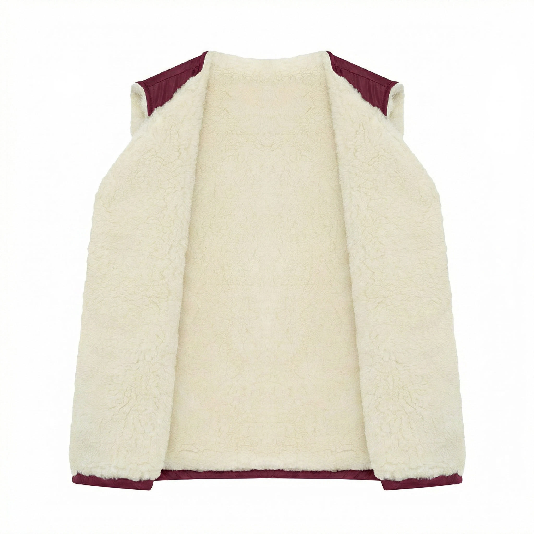 Это натуральная овечья шерсть, но не классическая овчина. Натуральный овечий ворс закреплён на текстильной основе, а не на коже — поэтому жилет легче и долговечнее, а тепло такое же: плотность ворса не уступает натуральной овчине.