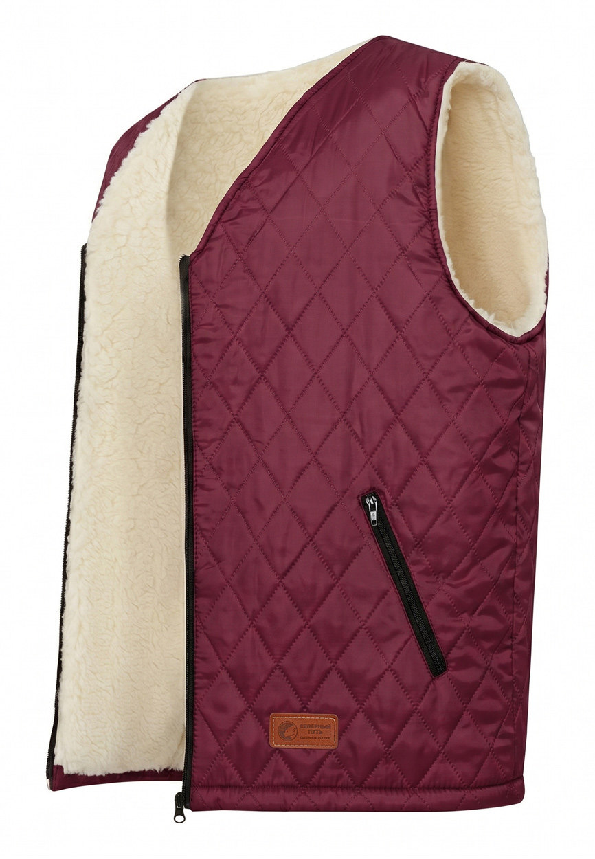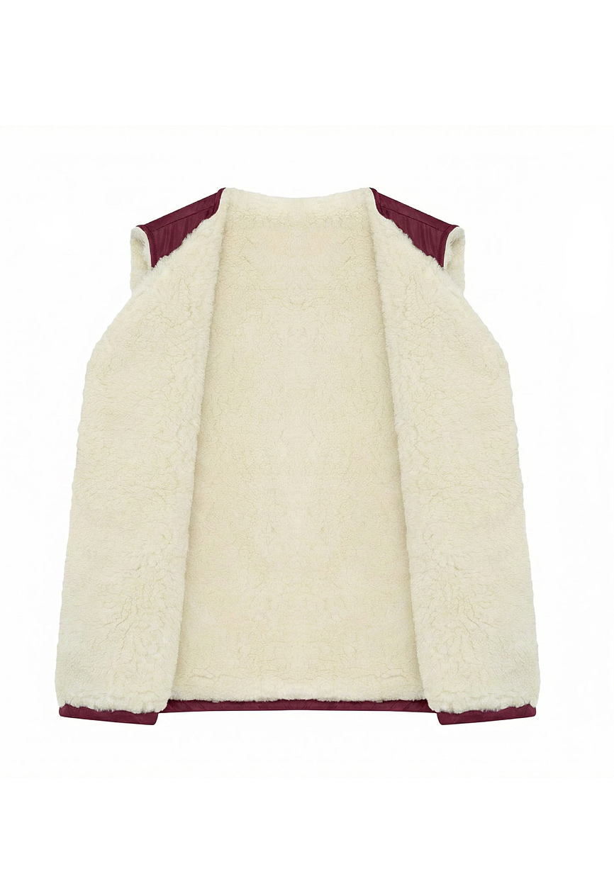Это натуральная овечья шерсть, но не классическая овчина. Натуральный овечий ворс закреплён на текстильной основе, а не на коже — поэтому жилет легче и долговечнее, а тепло такое же: плотность ворса не уступает натуральной овчине.